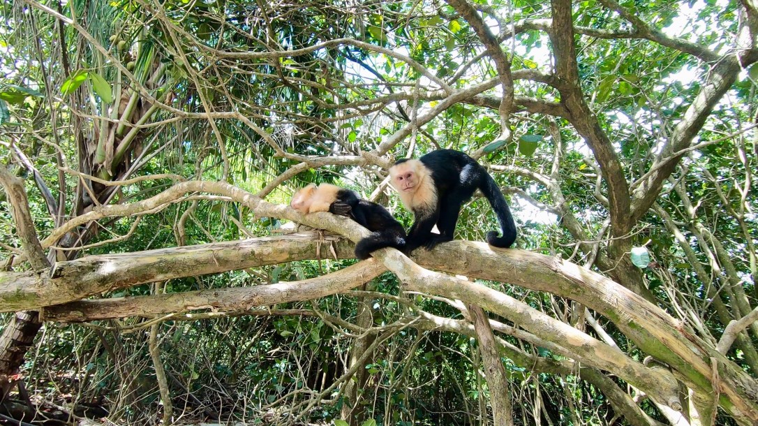 A short rain shower later, we have acquired our tickets and the ranger approves the contents of our backpacks for entrance into the park. Manuel Antonio is the most visited national park in the country. We are off season now and on a weekday, but it is definitely one of the busiest places we see during our two weeks; this being said, the only place where really many people stay in one spot is Manuel Antonio beach. The trails (some wooden, some concrete, few are “plain” jungle trails) are fairly quiet once we pass the entrance. We make our way to different viewpoints and different beaches. We see capuchin monkeys and raccoons, lizards of different sizes and colours, one lazy sloth hanging from a tree, one peccary (looks like a tiny brown boar), a coati, many butterflies, and we hear the impressive scream of the howler monkey.
