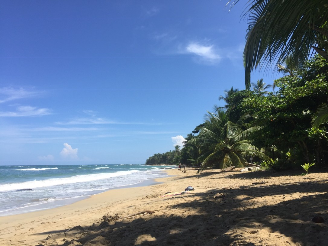 The next morning, we are off to Manzanillo beach, a little further south. It is not hidden from the road like the beach from the day before, but we finally find some crystal clear water so we spend another relaxed morning reading, tanning and swimming. After lunch, we head back to the chocolate place for an iced mocha. We run into two Italians we had met during the tour and exchange about our travel experiences. From them, we learn that the beach we were looking for on the first day is in fact a bit further north and that the water there is very quiet. We decide to check it out – the water is a bit muddier than in Manzanillo, but the setting is unbeatable. Jungle up to the water, calm waves, and we even spot a sloth curled up in a tree. It is already the late afternoon, so we decide that this would be where we would spend our last day on the Caribbean coast.