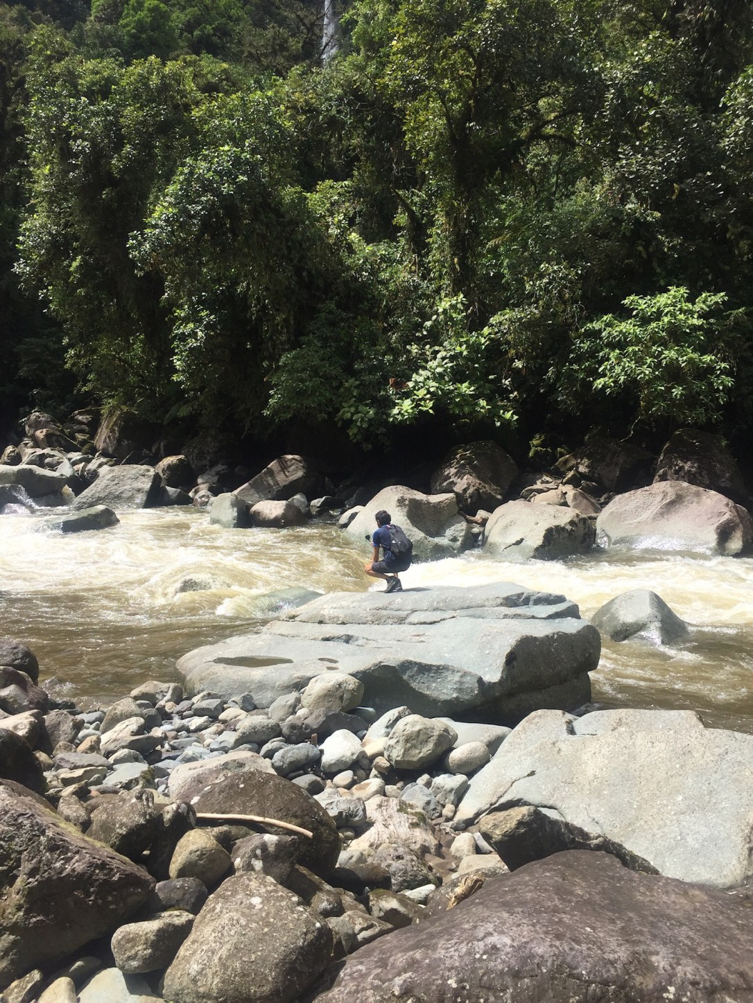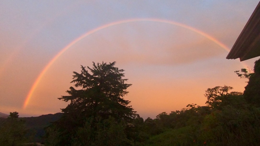 She welcomes us like family and offers us coffee, which we happily accept. The sun starts to go down soon after we arrive and we are lucky to witness probably the best sunset of our trip. The Orosí valley is bathed in pink sunlight, the Turrialba volcano is spitting ashes, and to top it all up, a perfect rainbow is painted into the sky. What a magical place. We enjoy Rosi’s home cooked food for dinner and call it an early night, as usual. We head to the Tapanti national park the next morning, a place known for tapirs – who, however, generally don’t show themselves to visitors. Rosi’s son Roger had shown us pictures of tapirs from a camera installed in the jungle, right behind the Finca. Tapanti is one of the less visited parks in the countries, despite boasting a beautiful waterfall and river and trails of different difficulties. Spoiler alert, we don’t see a tapir. We still enjoy the short hike very much; as there are far less visitors here, trails are kept more natural. Besides a few bridges and stairs, there are no wooden or concrete trails. We do the easy and the moderate trail and decide to leave it at that.