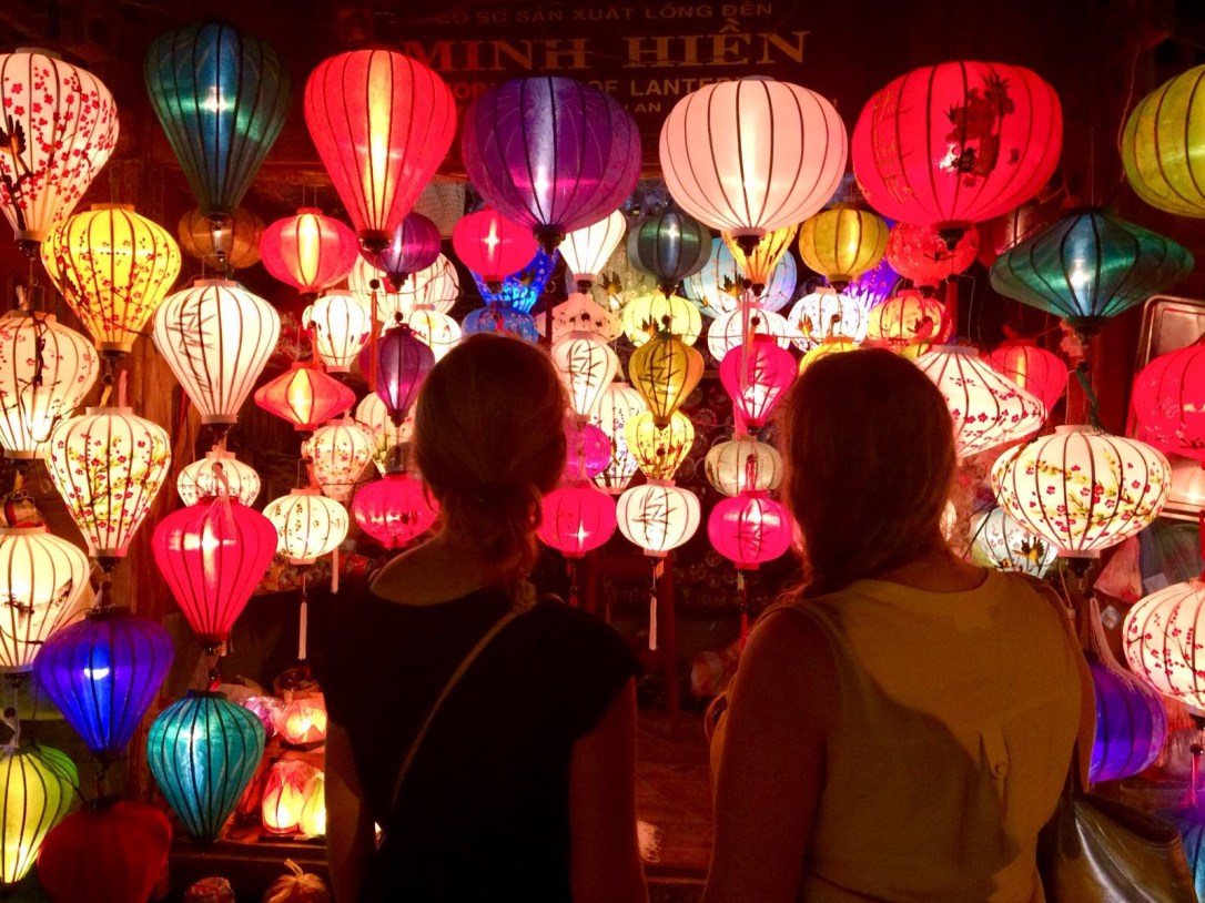 before heading to lunch in a shadowy garden. The midday heat makes us crave a nap, and a dip in the hotel’s pool, before heading out again for some cocktails and dinner, where our friends introduce us to a delicious vegetable called morning glory, or sea spinach. Cooked with garlic, this tasty green should become Julia’s “no other veggie option” meal more than once. Hoi An is buzzing with people, strolling through the streets and markets, cheering for the street artists. The lanterns that decorate the entire town, create an amazing atmosphere with their colourful, dim light. Even the river is illuminated with lanterns.