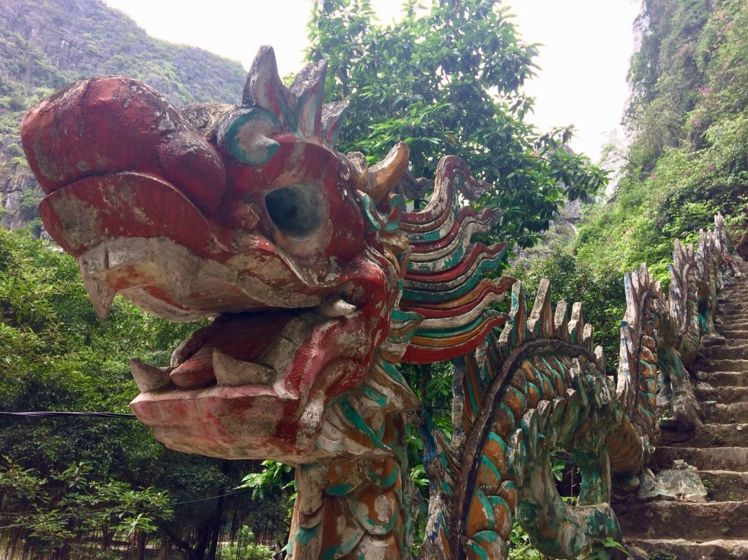 We settle into our little bungalow and rent some bikes from the hotel. We pedal through rice fields until we find what many people come here for: a jetty with wooden boats and their owners, ready to take you through the rice fields. The rowers are exclusively women, and they row with their feet – very impressive! Our rower speaks a few words of french and giggles every time a duck dives next to us. The fields and caves are impressive, but after two hours we are ready to go home to the dinner we ordered at our bungalow. For Julia, this was one of the best meals in Vietnam and the discovery of an amazing vegetarian dish: tofu in tomato sauce. With very happy bellies, we go to bed. The next morning, we take our bikes a little further to the Mua Cave Viewpoint. We climb what feels like 1 billion stairs but the view is worth it.