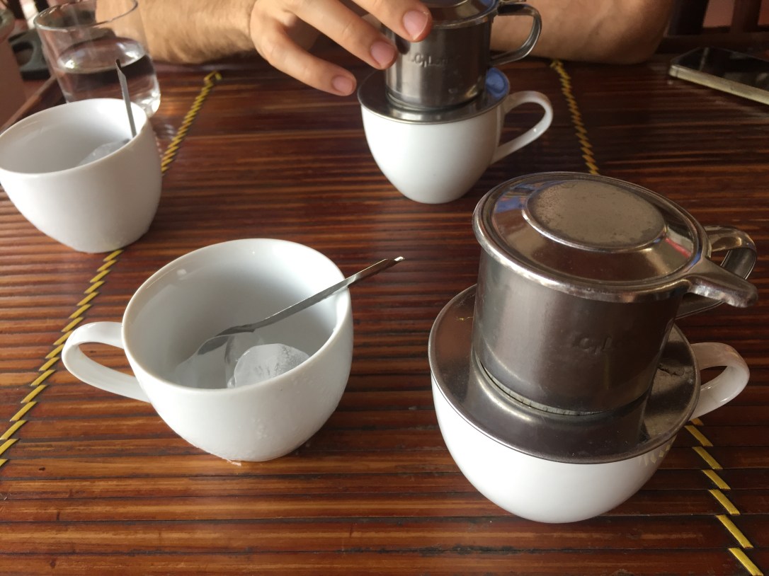 While in Vietnam, we enjoyed drinking our coffee with condensed milk and ice cubes. The coffee filter sits on top of the cup or glass and water drops slowly. We bought the coffee as well as the filters as presents and for ourselves and while we use the filters much less than we care to admit, we have a definite coup de coeur for the Vietnamese coffee beans. We got ours at Phuc Long Coffee as recommended by our friends. It’s a chain you can find all over HCMC and the coffee comes in big bags, unlike in the hipster places in Hoi An. We’re thinking of stopping by Vietnam during our next trip just to buy some more coffee. 😉