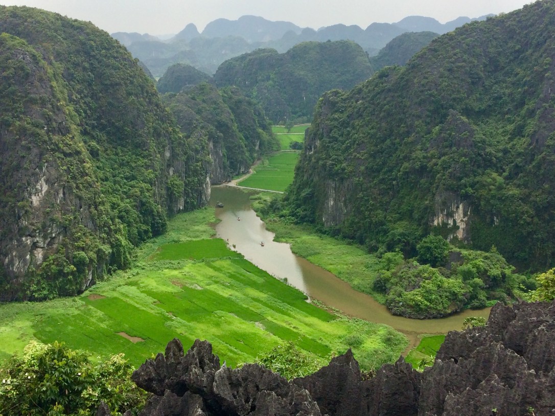 After two days in busy Hanoi, we hop on the train towards Ninh Binh, known as the terrestrial Ha Long bay. The descriptions of the crowds in Ha Long bay, together with stories of precarious boat rides didn’t appeal to us at all, so we followed our friend’s suggestion and head south of Hanoi to Ninh Binh. After a few hours on a comfortable train, a taxi takes us to the lush fields of Tam Coc, where we are welcomed by the lovely Julia.