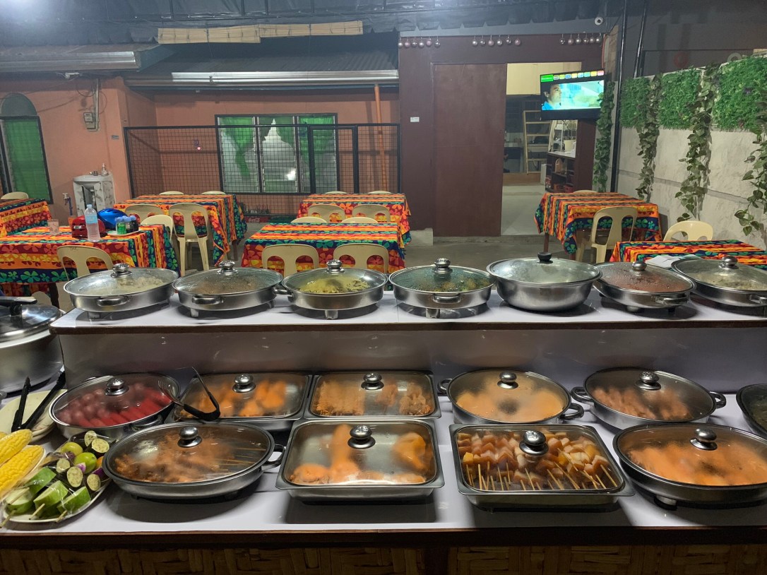 This first homemade meal will probably stay in our memory forever, it was definitely one of the most delicious things we ate so far in the Philippines. Ever since, we had usually at least one of those meals per day, sometimes in very small places with just three pots, sometimes in bigger places that are almost restaurants. We paid between 1 and 5⏠for the both of us, depending on the location of the place (tourist area or not) and of course, the quantity. Besides being delicious, it’s also nice to choose exactly what you want, depending on your appetite at that moment. Don’t be shy to look into the pots and to ask questions. It already happened a few times that we had to drive away because there were no veggie options (left) – no issue here.