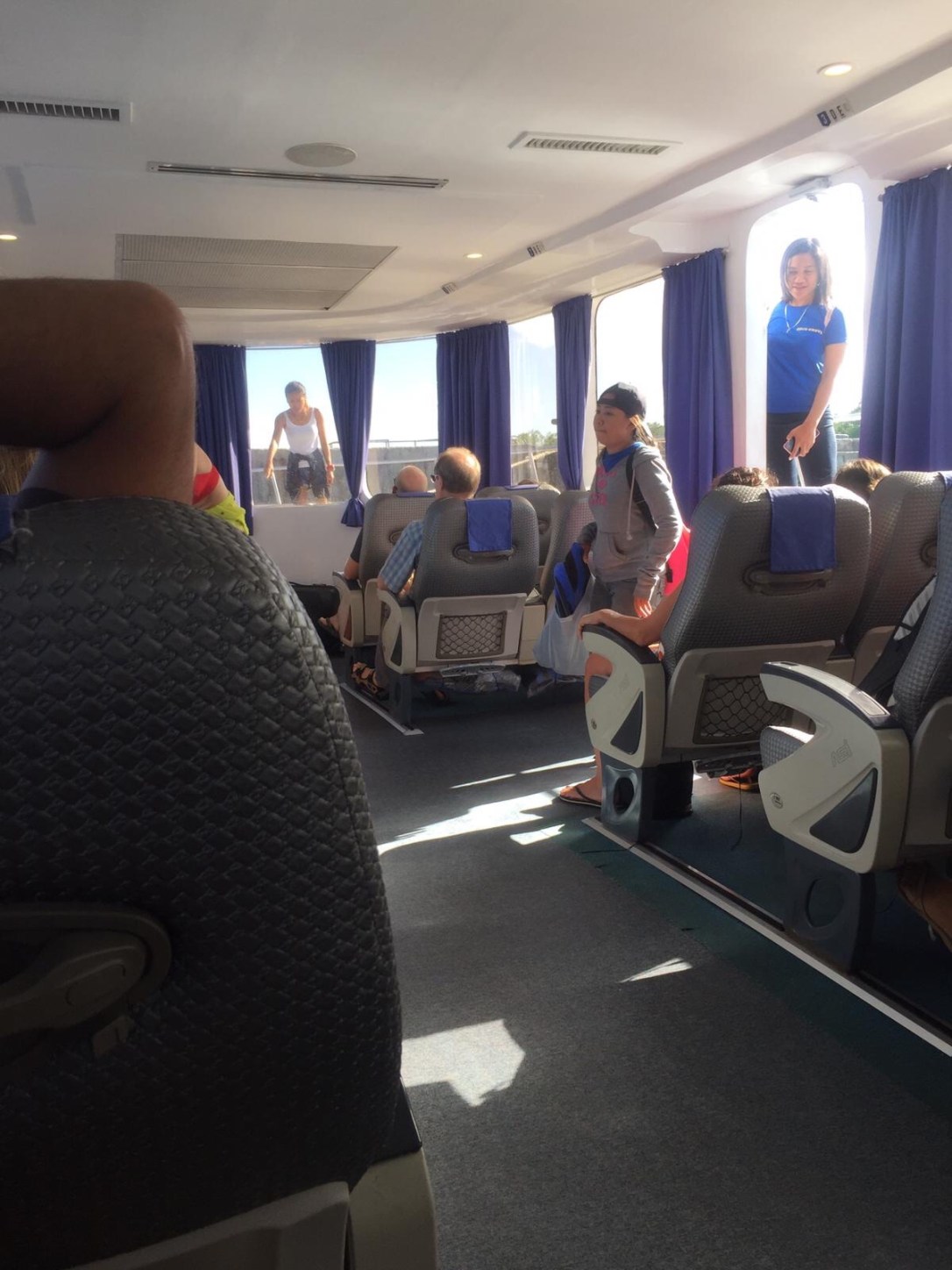 At 6am the next morning we are wide awake because of our rooster friends, but this also means that we don’t have to rush too much. At 6.45, we are already on Charlie’s boat (Brice’ acquaintance from the day before), with a few islanders who are off to run their errands (we assume) on the “mainland”, i..e. the island of Negros. Finally it really pays off that our backpacks have raincovers and that our valuables and documents are in the dry bag. Despite the fairly quiet ride, we get a little soaked during the trip. But our stuff is dry! Charlie, who speaks perfect French as he used to live in France, sets us up with a tricycle for Sibulan Port, from where we will cross over to Liloan on Cebu Island. And from there, we are only another short tricycle ride, about 2h busride, and one more short tricycle ride away from our destination: Moalboal, or to be precise: Panagsama Beach. The busride shows us an amazing scenery. Coming from two fairly remote and small islands, we somehow imagined Cebu Island as an urban area, but that is not true at all (even if it might be more densely populated than Siquijor and Apo). The sea to our left is as blue as it can be, and the roads cross through banana and coconut palm trees, small and big villages.