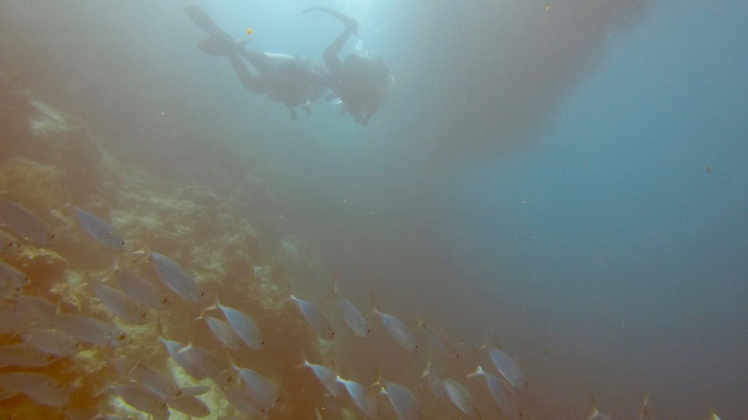 Moalboal is a famous diving spot, and it is mostly known for its sardine run. Thousands of sardines are swimming close to the reef to feed. The “reef” in itself is quite impressive, you can basically walk there and then whoops, it drops to 60 metres. For divers, this is amazing, as you don’t even need a boat to start your dive. We spotted the sardines already while snorkelling (also met a couple of turtles again), but decided that this would be a nice place to dive – and for Julia this would be her first dive ever. We sign up for a “Discover Scuba Diving” for Julia and a Fun Dive for Brice. For Julia, this means back to school (well, for like half an hour) to familiarise herself with the basics of scubadiving, before getting a more in-depth introduction by the dive instructor. This new knowledge is then practiced a litte bit in the water, and off we go – Julia with the dive instructor, and Brice with an aspiring dive master.