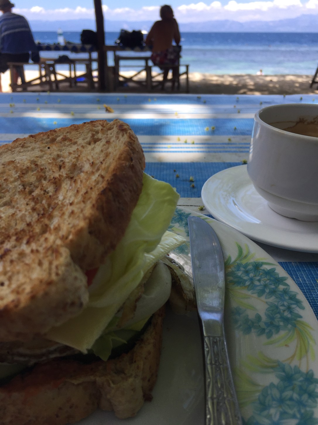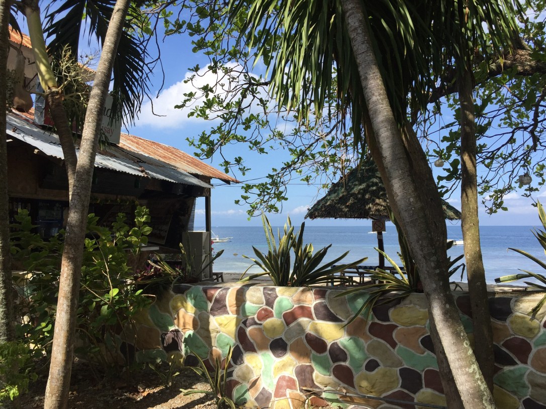 Maybe our favourite spot in Moalboal was a little kiosk with a few tables. They have some bamboo mats and large cushions, which you can grab whether you consume anything or not. Quite nice, isn’t it? From here, you can enjoy the shadow in the morning and the sun in the afternoon, and you can have anything from breakfast to dinner, from iced coffee to beer. We spent many enjoyable hours here.