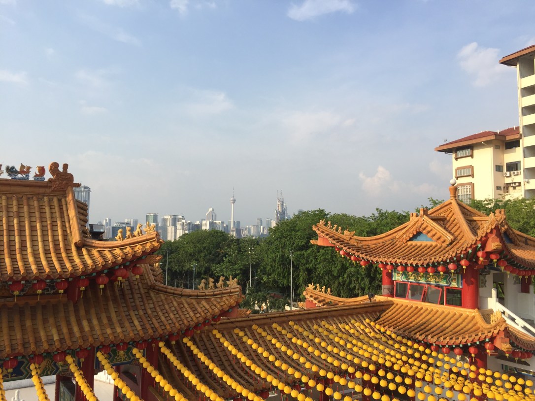 Unfortunately, it’s not yet dinnertime and we have one more destination: the Thean Hou Temple, situated in a residential area of Kuala Lumpur, with a wonderful view of the city. The Buddhist temple is beautifully decorated and while we imagine that it can get quite busy, there are only a few other visitors.