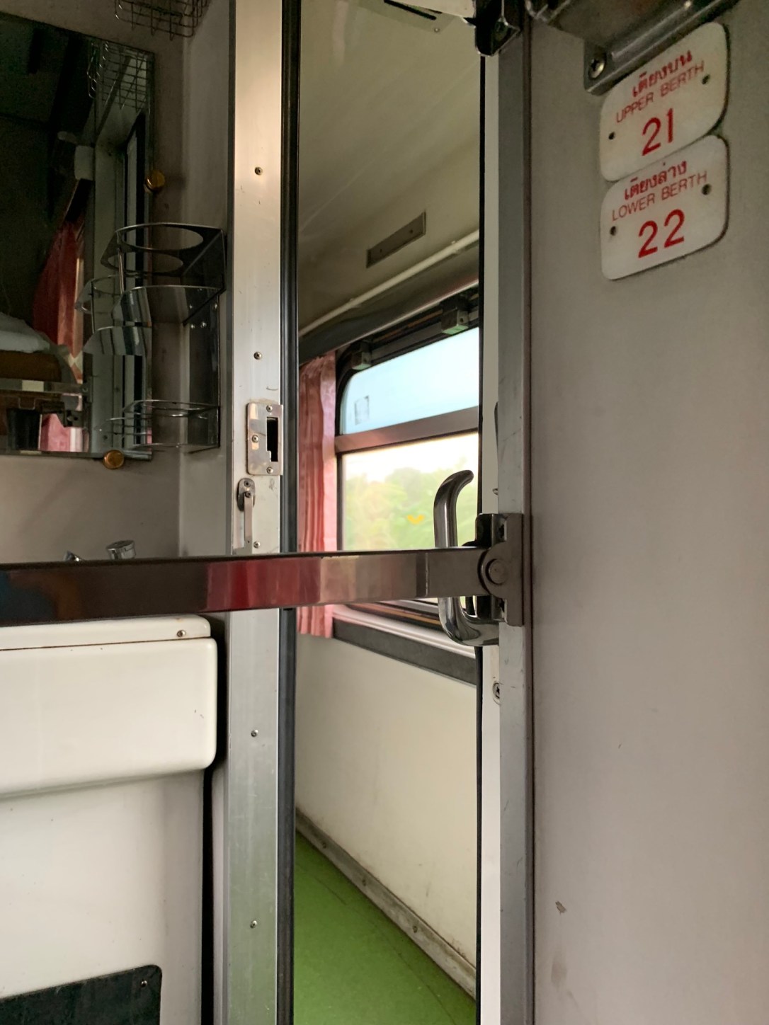 Koh Samui sends us on our way with some rainy, humid weather, onto Surat Thani on the mainland. Here, we’re catching a night train to Bangkok and we’re quite excited about it. Thailand’s trains are supposed to be excellent. We’re not disappointed. We booked a first class ticket, which gives us a little cabin just for the two of us. It’s a bit crammed but it has a little sink and the sheets are spotlessly clean. Goodnight!