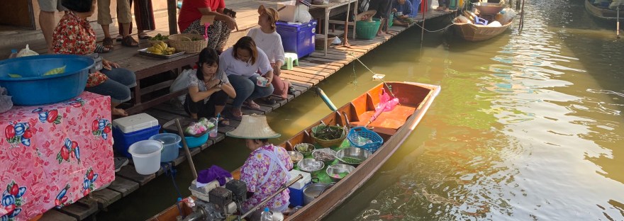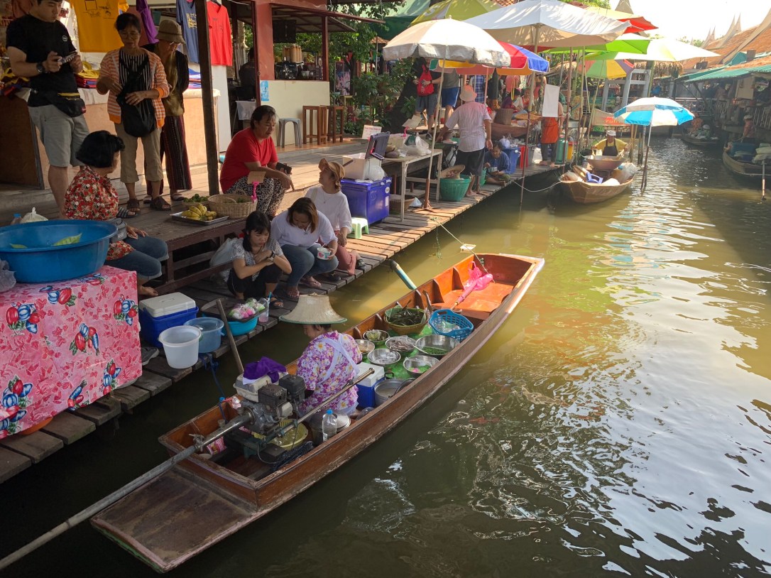 The next morning, we have more activities planned (our batteries are fully charged after our time in southern Thailand!): we want to see a floating market and picked the one in Taling Chan (we have no desire to get up at 6am to take a tour to one of the bigger but apparently very touristy markets outside of Bangkok). We reach the market in just about 15 minutes by cab. It is delightful! The floating part is limited to a few boats and the main area where you can sit down to eat your lunch. The non-floating part holds the bulk of food and souvenir stalls.