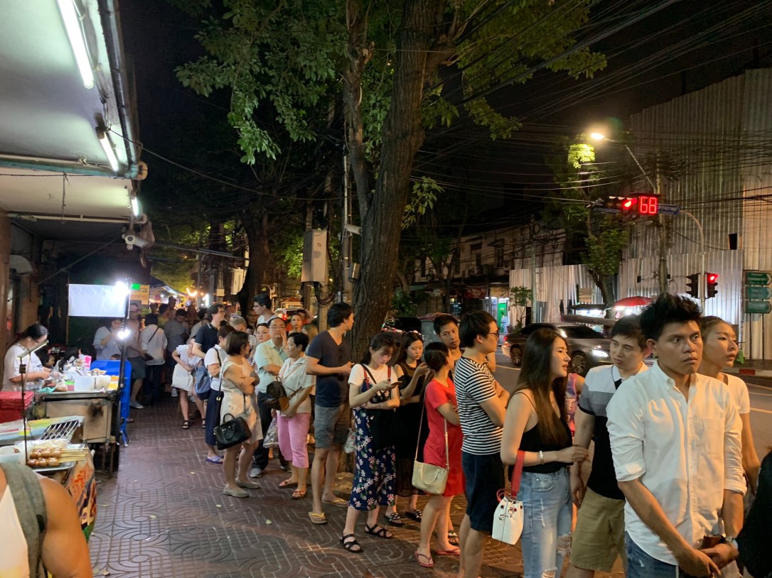Late the next morning, a taxi drops us at our hotel, where, despite our early arrival they let us check in. Yay! This gives us time to rest and freshen up before we head out to lunch with our friend Florence, who lives in Singapore and came to spend the weekend with us in Bangkok. We meet her in Pratu Nam, where there’s supposed to be a whole lot of food – and lucky us, we can even go there by boat! We catch up over Pad Thai and a coconut. Flo has to go back to work for a few hours, while we run a few errands in the nearby Siam Paragon mall and in Khaosan road (ok, we may have had another Pad Thai there), before having a nap. In the evening, we have a recommendation to have omelette at a place called Jay Fay, in walking distance to our hotel (which is next to democracy monument). We stroll along the canal only to find ourselves presented with a whole street food area (on Maha Chai Road)! Little did we know, however, that Jay Fay is one of Bangkok’s most famous places for street food, she has a Michelin star. Our jaws drop when we see the queue and we decide to push that to another evening and head to the noodle place next door, which serves delicious pad Thai (we’d only eaten two that day, so that was fine). A bit of mango sticky rice, and we are off to bed with happy bellies. This little street corner would become our go to dinner spot, but spoiler alert: we never made it to Jay Fay. The next day, we send an email asking to reserve a table for the evening and they respond that they are fully booked for the next three months. Insane.