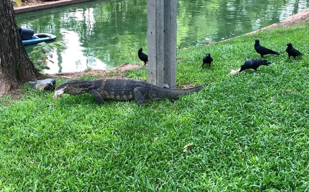 Of course we ate everything we cooked and despite feeling more like laying down than walking, we decide to make our way to Lumphini Park, about half an hour away. It’s boiling hot outside but we brave heat and traffic to get to the park and look for the famous lizards that reside there. We don’t have to search for very long until we find a giant lizard swallowing a fish whole, unimpressed by the crows surrounding him, hoping he’d share. Yikes. These lizards are a curiosity of the park, where they live freely, but apparently they have started to become a nuisance to inhabitants, showing up in their kitchens and stuff. And they are HUGE. We’ll see what the future holds for the Lumphini park lizards.