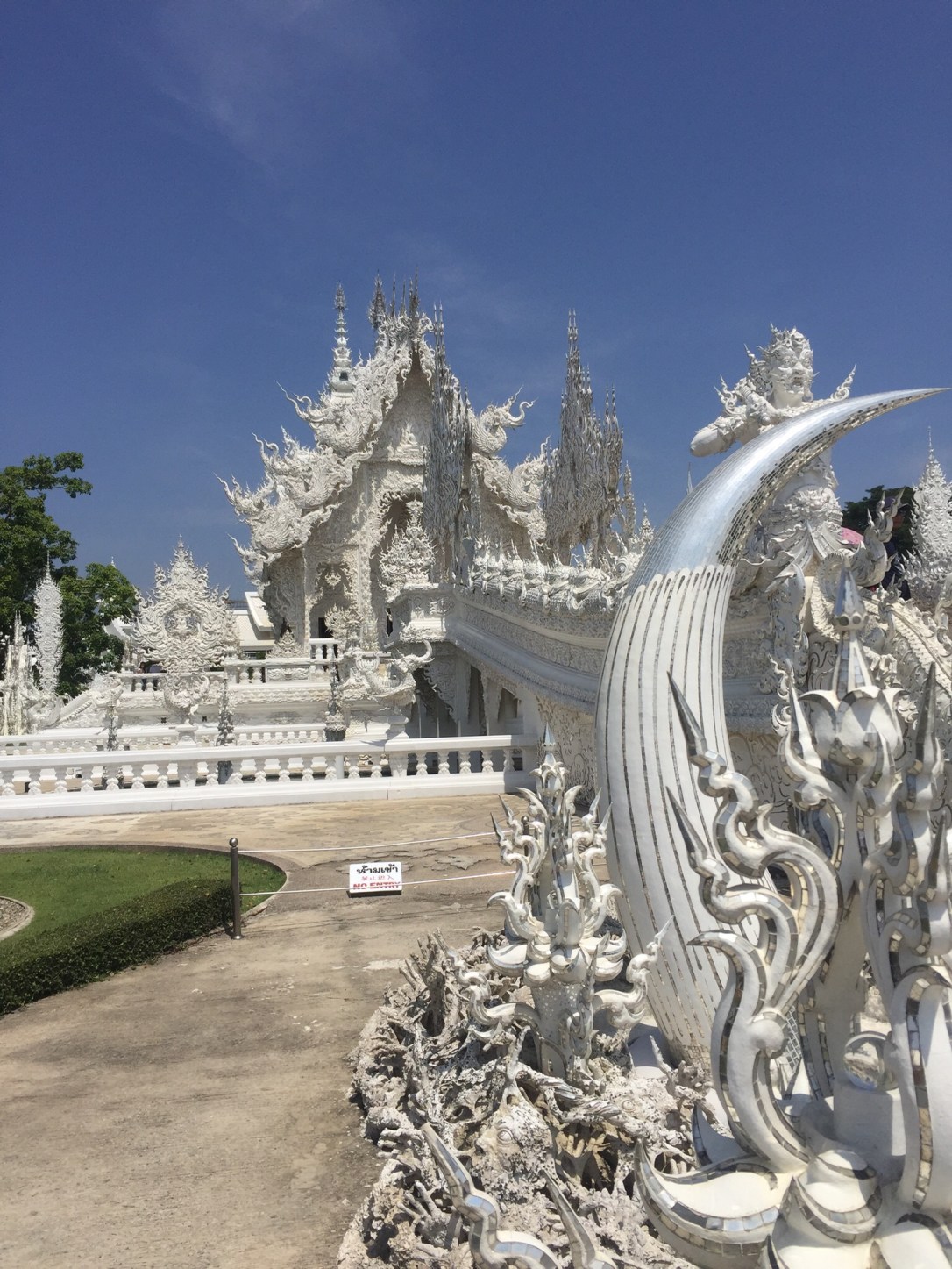 We only have one full day, so anything we want and need to do must be done on this day. True to our style in the Philippines and Malaysia, we send postcards on the last day in the country (we already bought the Laos ones, but they are yet to be written…), so our first stop is the post office. Then, we are off to see the White Temple, probably the most famous one of Chiang Rai, despite (or because of?) being very recent. It is (surprise, surprise) completely white and has been built since 1997. Construction is meant to be ongoing until 2070 (!). For some reason, this is the only place where we encounter crowds since our arrival in Thailand. Large groups of Chinese tourists stream into the temple and it is difficult to enjoy this weird construction. We only stay for a few minutes before we escape.