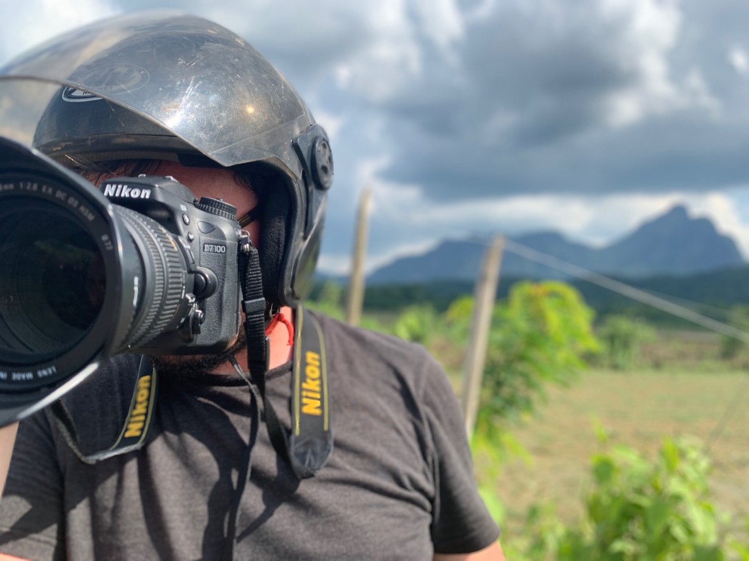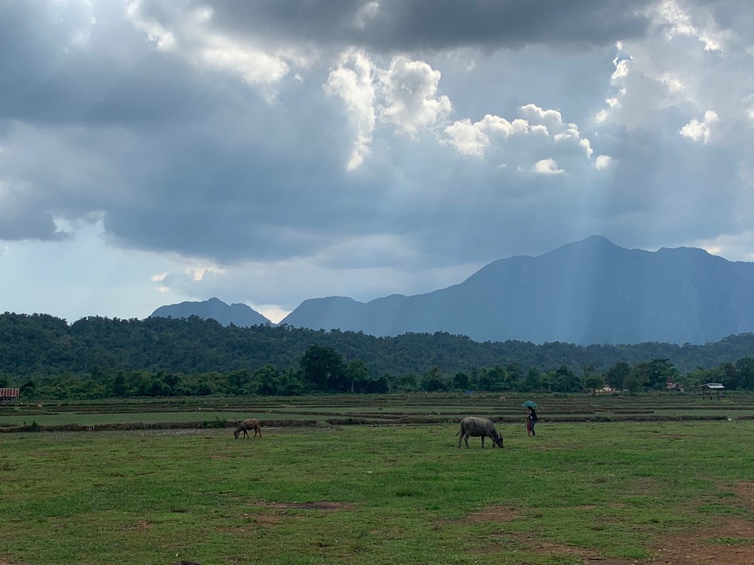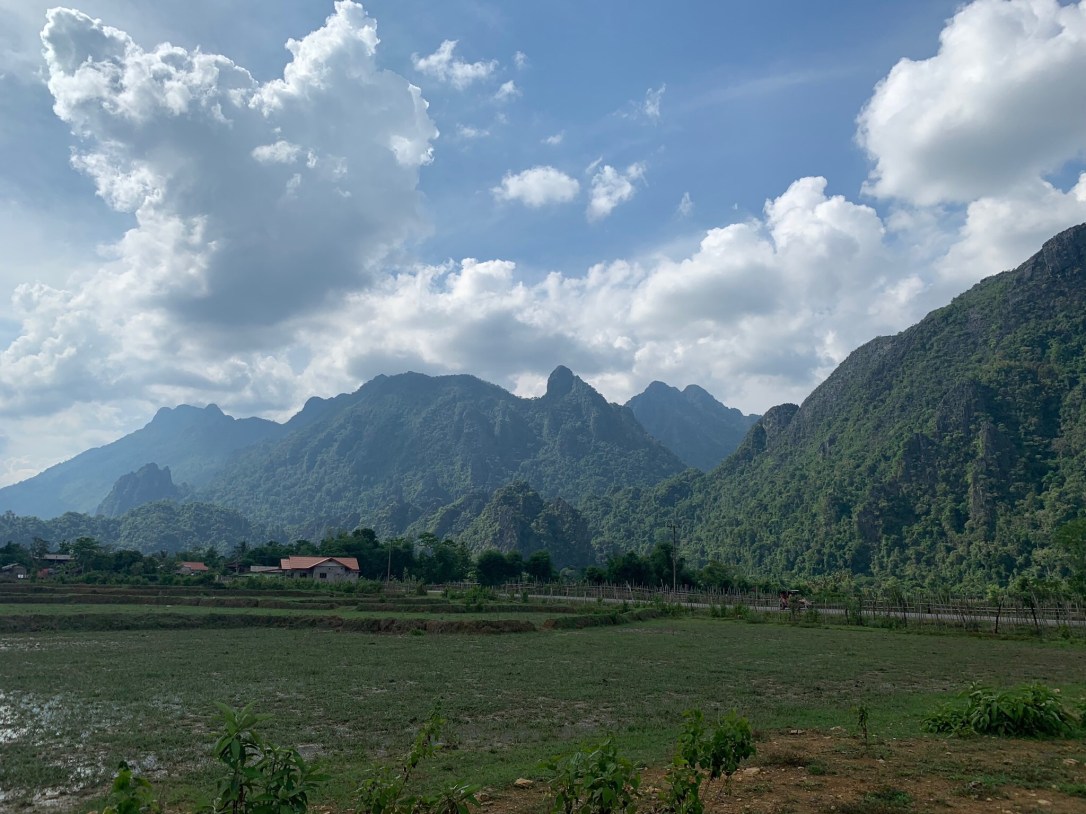 Tubing used to be the main draw for party hungry tourists to come to this place. The game was to tube down the river, stopping at every bar along the way, to drink anything from a beer to a happy milkshake. As you may guess, this did not always end well and at some point, the government decided to forbid tubing. Nowadays, you can do it again but the river is no longer lined with bars and we mostly saw Chinese and Korean tourists being driven up the river. We don’t have any particular interest to throw ourselves in the river and opt to explore the surroundings. The town itself has no charm whatsoever, so we take a motorbike direction one of the caves. The landscape is stunning – karst rocks define the scenery, peaking out in the middle of lush rice fields and buffalo herds.