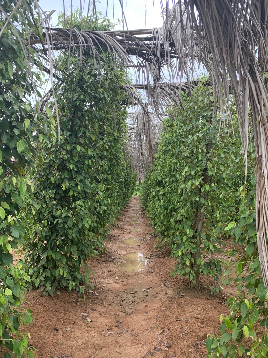 We do, of course, learn that all colors pepper come from the same plant and are just different stages of ripening (or peeled, in the case of white pepper). And we also learn that there is only one other place in the world where pepper is of protected origin is, in Cameroon. Kampot pepper is a protected designation – it has to actually come from the region and there are strict rules for the production. While the knowledge of growing the peppers is centuries old, the French colonialists first started to produce industrial quantities. Some hypothesize that since growing the pepper is similar to growing wine, the French brought the knowledge for larger scale production. When the French left upon the arrival of the Khmer Rouge regime, the knowledge got lost and only recently has the production picked up again. Much of this information didn’t actually come from the first visit we did at La Plantation. After we did buy a couple of packs of pepper, we left a bit disappointed by the experience and remembered we had seen another sign on the way, to the BoTree Pepper Farm. As we arrive, there is just one other visitor – just finishing her lunch. We also order lunch and it’s one of the best meals we had in Cambodia, with the delicious Kampot pepper being the star. With full bellies, we get ready for our second pepper farm tour of the day – and the volunteer who is taking us around is so passionate about his work that we don’t even see time go by. Not only does he know a lot about the pepper, but also about the historical context and current pepper affairs (see above). Who knew there was so much to know about pepper?